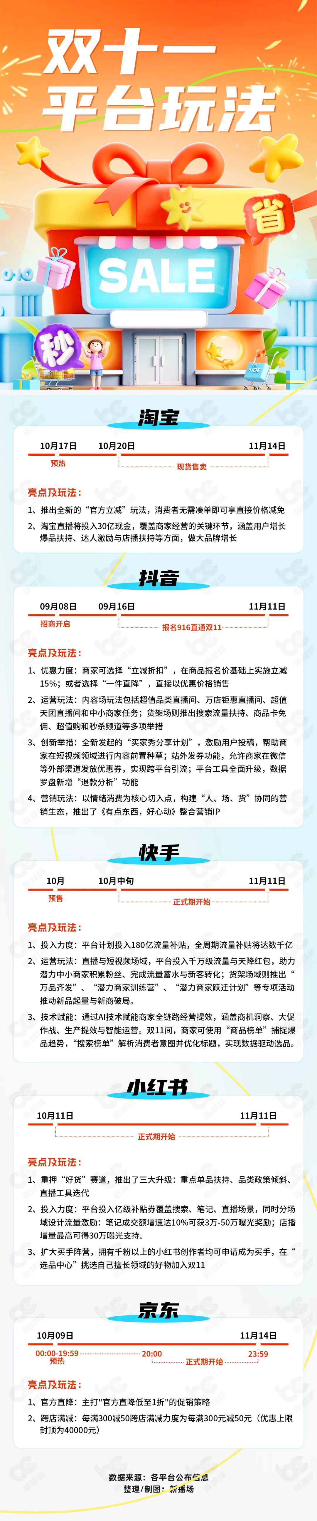新播场统计整理了淘宝、抖音、快手、小红书和京东五大平台的双十一节奏和公布的扶持计划、相应的玩法,详情如下图: