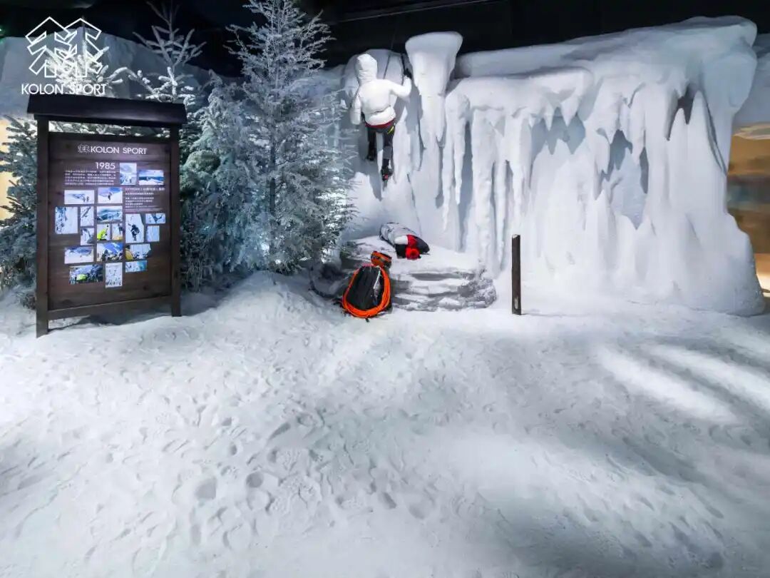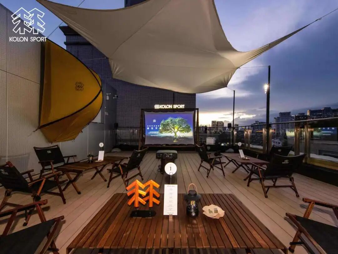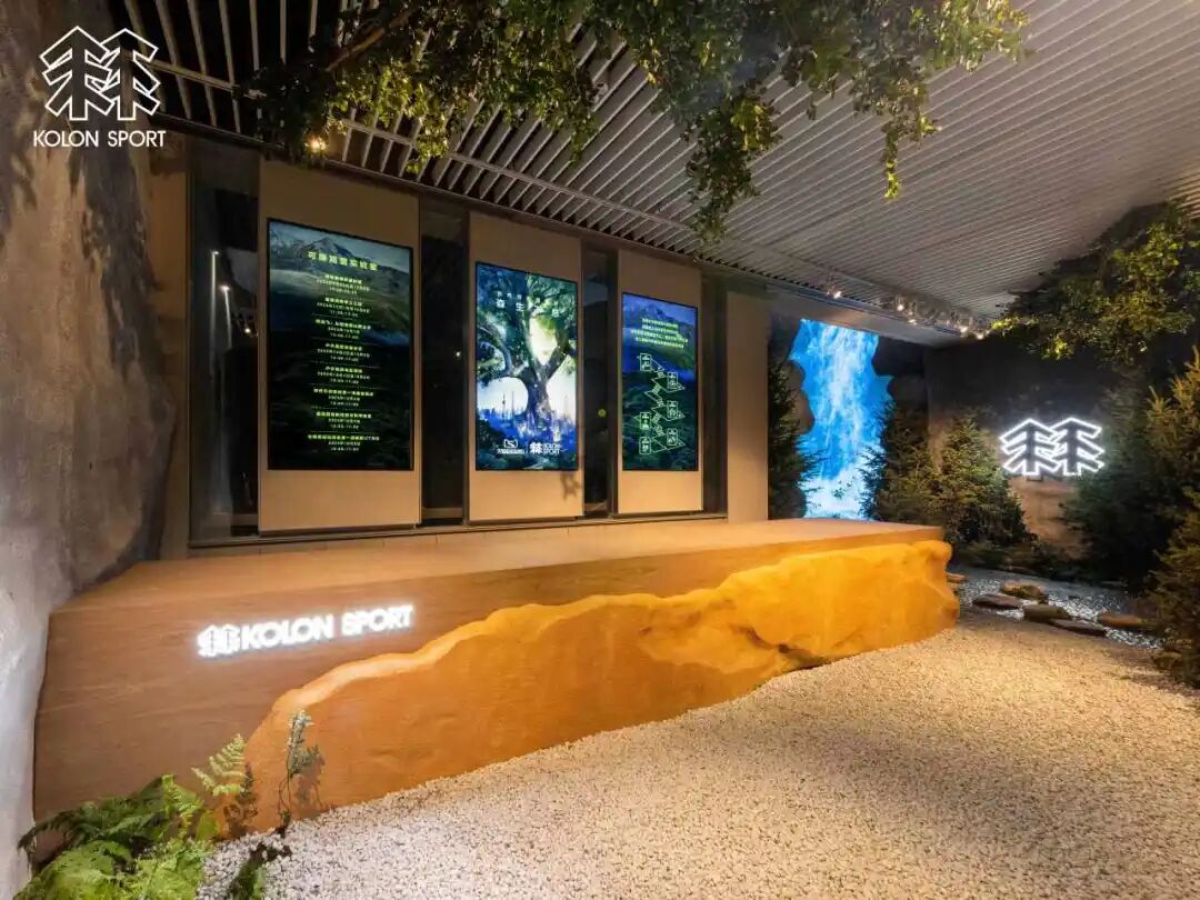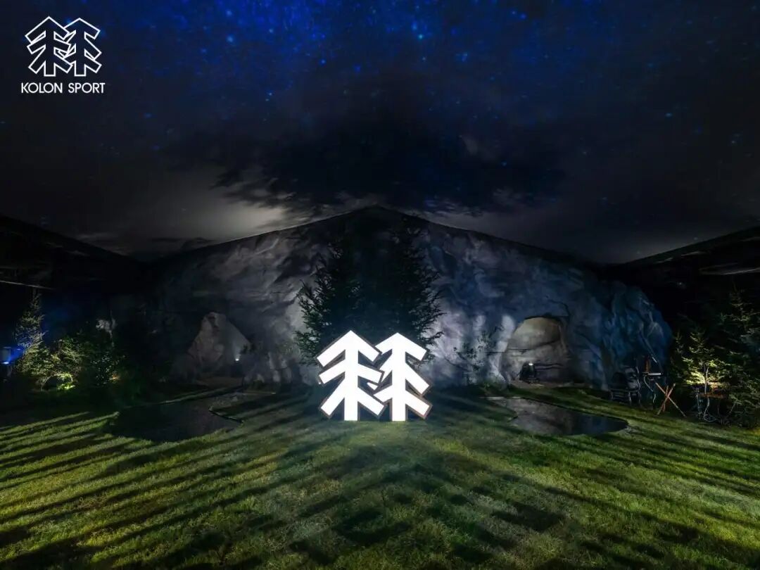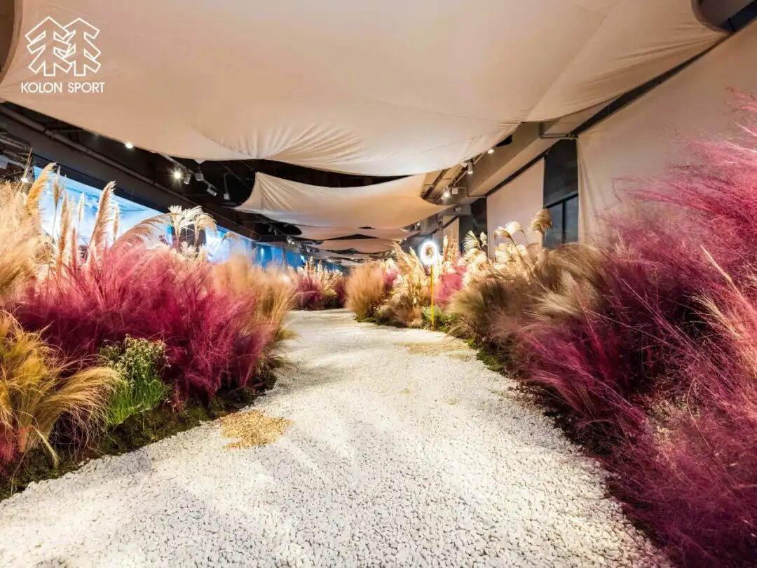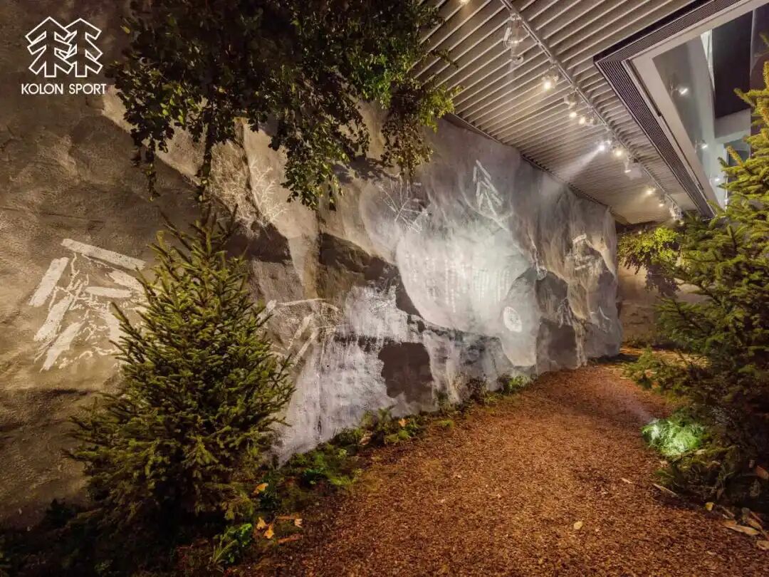 一层是湿润的林径,空气里弥漫松针与冷杉的香气;半层是粉黛子花海,风一吹就起浪;二层是雪山,温度骤降、雪松气息沁人;三层是洞穴探秘,头灯照亮荧光壁画,讲述品牌五十余年的专业故事;最后一层的露台上,帐幕轻摆、光影如瀑,城市天际线与自然交汇。