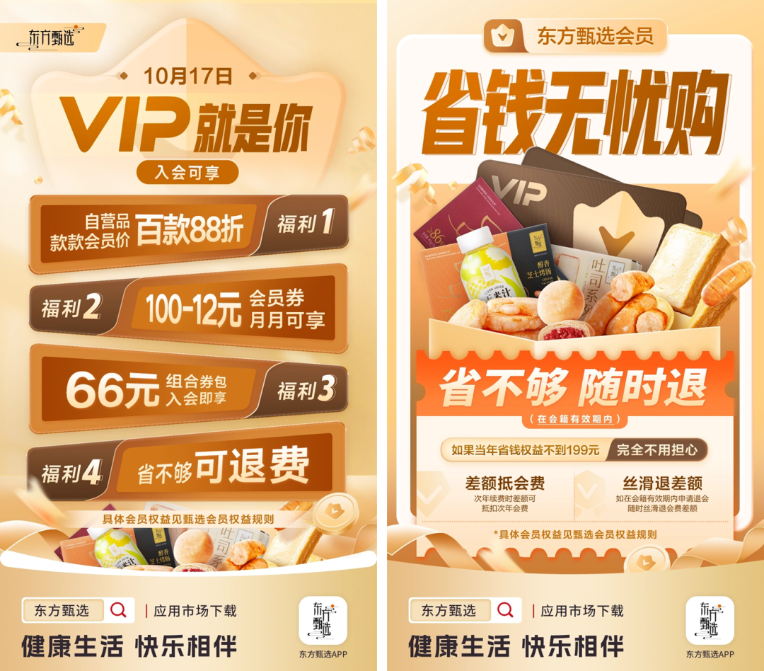 又比如,东方甄选APP的会员权益,权益直观,利益点很明确,一句“省不够,随时退”就解决了入会后的疑虑。