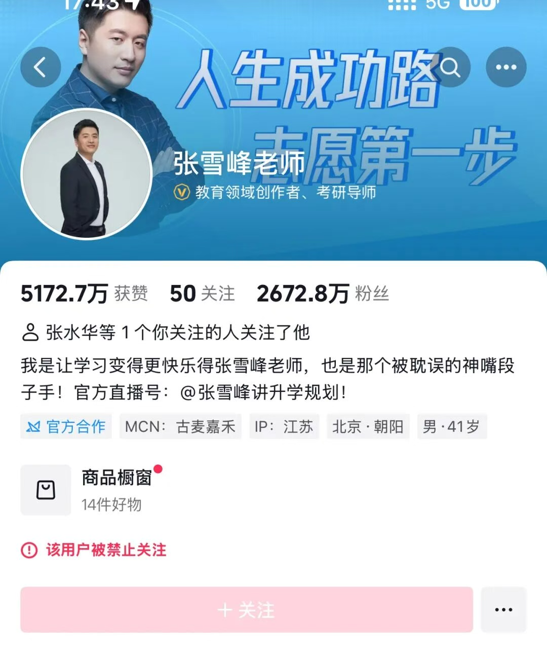4、9月24日,张雪峰在主流平台的账号,全部被禁止关注,理由是违反社区规定。