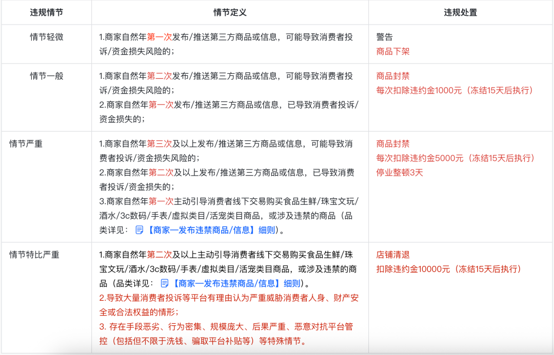 如果你是商家,你要引流到第三方也是不允许的,它同样有阶梯处罚的机制,具体如下: