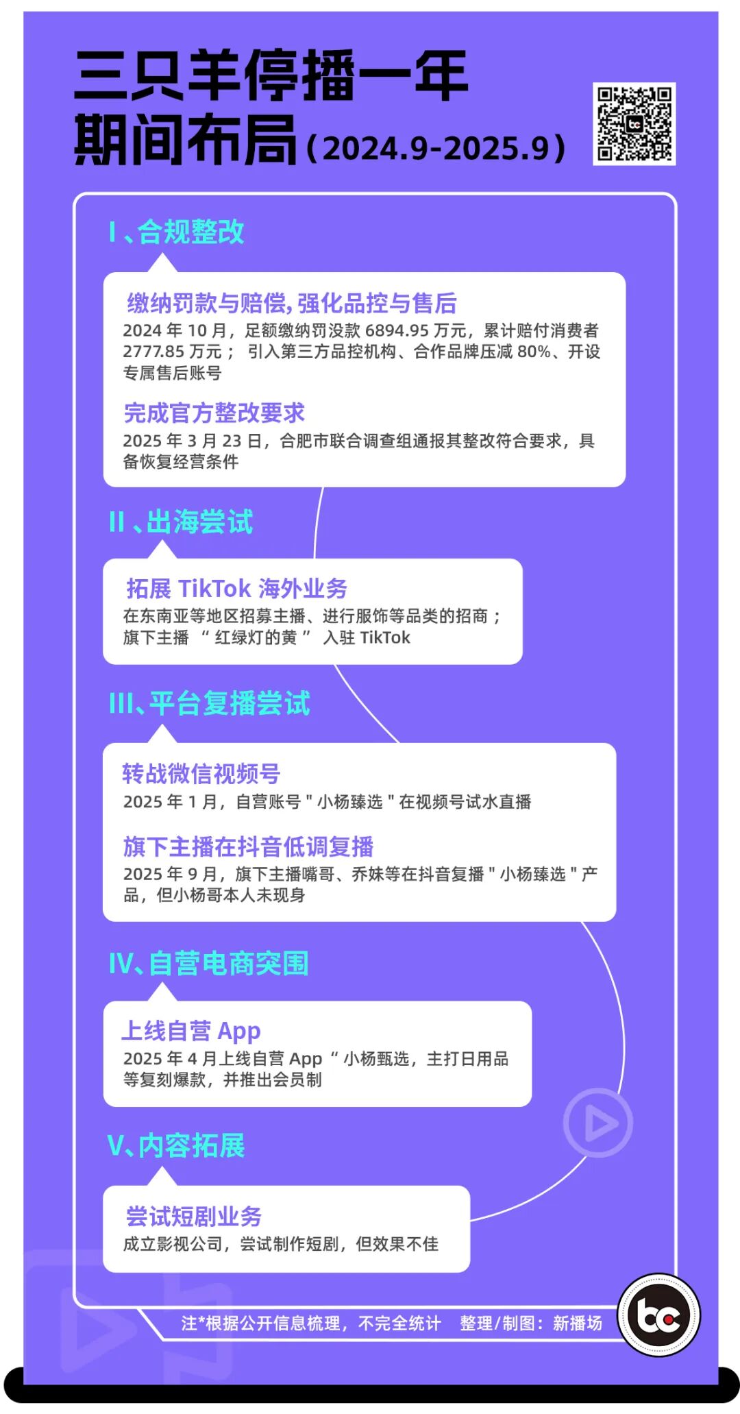 在停播的一年里,三只羊并未停下脚步,而是积极布局多个方向,包括出海、知识付费、自建平台以及试水新渠道。