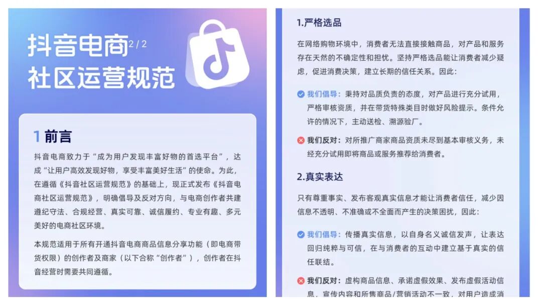 9月21日,抖音电商正式发布《社区运营规范》,明确要求创作者严格选品、主动送检、溯源验厂;反对演戏炒作,虚构商品信息,承诺虚假效果。这是抖音首次以规范形式表明了平台扶优打劣的坚定立场。