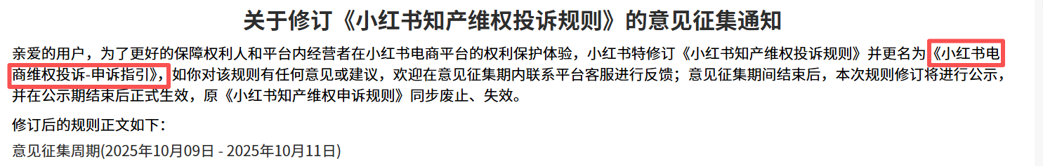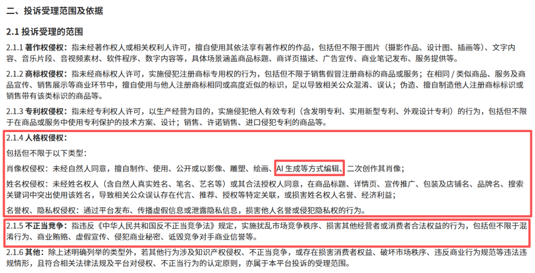 开工后第一天,小红书电商学习中心同步响应,修订并更名了《电商维权投诉—申诉指引》,正式将“电商交易场景”下的不正当竞争、人格权侵权、AI生成内容滥用等纳入可投诉范围。