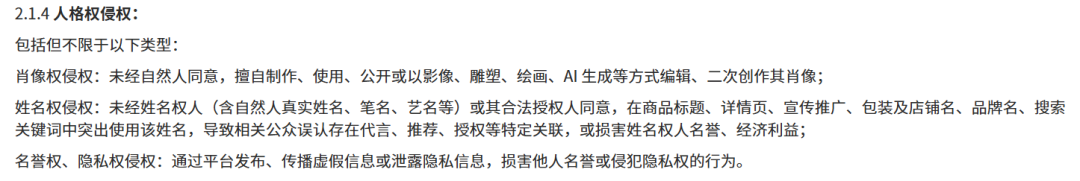 值得注意的是,在“人格权侵权”条款下,写入了“AI生成”等表述,明确若未经自然人同意,擅自制作、使用、公开或以影像、雕塑、绘画、AI生成等方式编辑、二次创作其肖像,均属侵权。