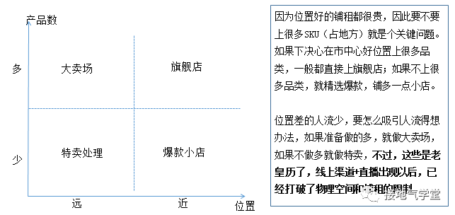 - 产品价格:因为铺租、人工不同,有的卖场就是死贵死贵的在传统线下门店里,关于卖场位置也有个矩阵模型。(如下图)