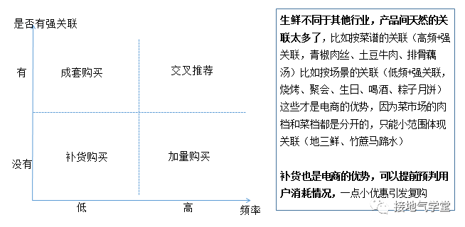 有一个简单的矩阵模型可以描述生鲜产品的复购思路,核心是产品购买频率和产品关联度。购买频率上文有解释,产品关联度指的是某些产品天生会一块买。特别在生鲜领域,比如买了冻鸡翅、竹签,很有可能会买木炭、丸子、烧烤汁,因此两维度交叉既有如下矩阵(如下图)。