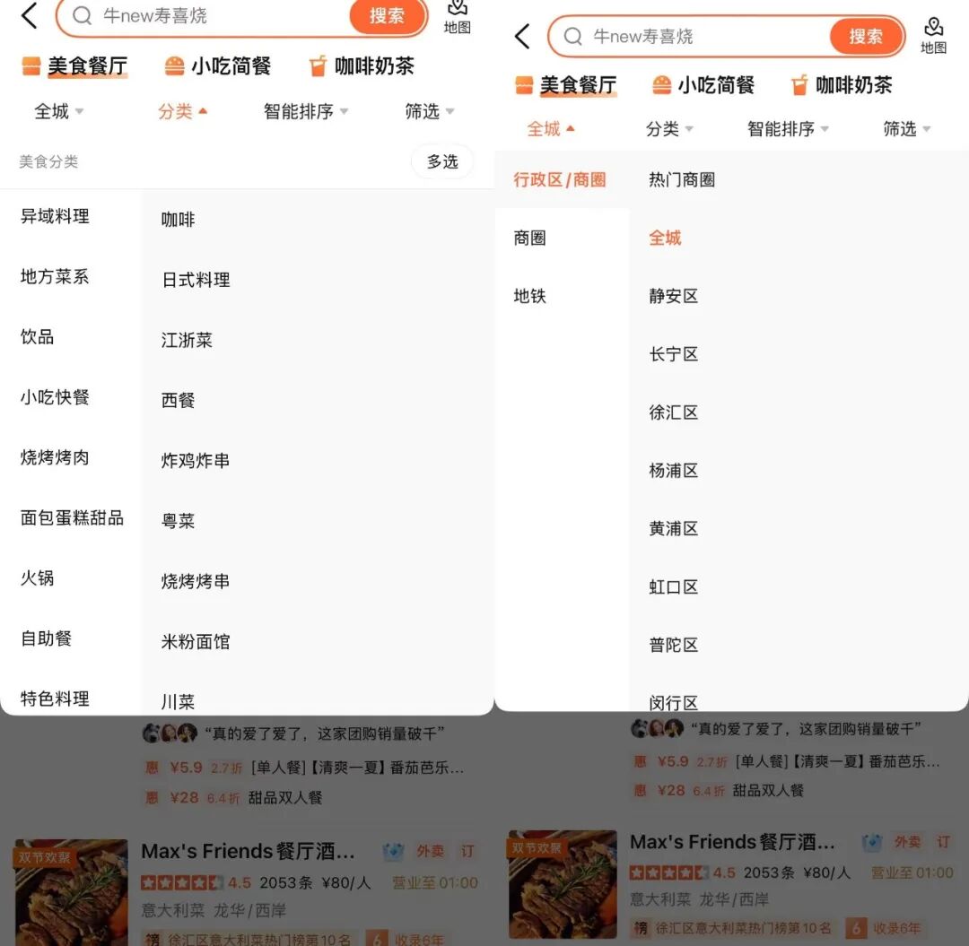 大众点评按地方菜系、热门商圈等更细分的维度给餐厅分类
