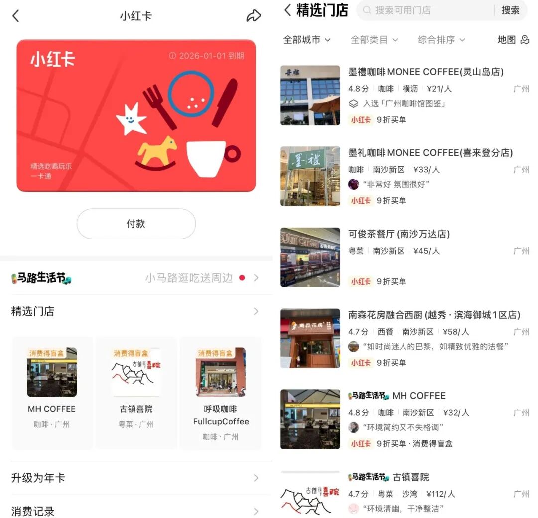 小红卡是平台基于AI等技术分析社区用户的口碑评价后,给出的一份吃喝玩乐「精选」指南,也是一张168元年费的会员卡,购卡用户可在开通「小红卡」的门店消费享9折优惠,同时享受门店随机给予的盲盒等附加福利。