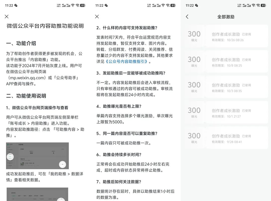 其是微信公众号的这一做法很早就有苗头了,在2024年七月份,公众号就灰度上线了“内容助推”的服务,当时这个服务主要还是给新手公众号创作者使用的,他们达到一个里程碑就送一张助推劵,使用之后就可以给文章增加曝光。