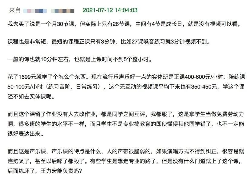 半年后,2021年7月12日,王力宏在抖音进行直播,为自己的声乐课程带货,王力宏化身“王老师”,向观众介绍了自己的声乐课程及方文山作词课程。声乐课标价1699元,价格高昂,为了刺激消费,王力宏承诺:“只要卖掉 3000 份课程,我就送一个你们最想要的礼物——我把胡子刮掉。” 当晚,“王力宏经历了什么”“王力宏直播”“王力宏刮胡子了”等话题先后登上微博热搜,但从网络上的用户反馈来看,课程售后没能让用户满意。