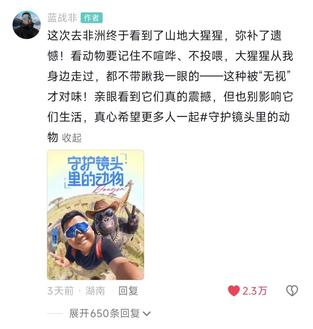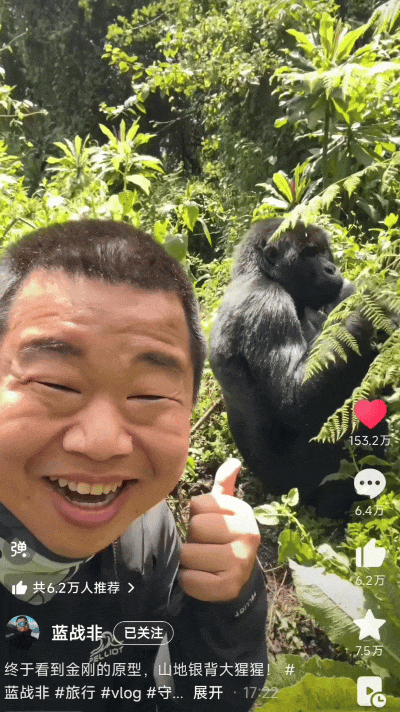 “这次去非洲终于看到了山地大猩猩,弥补了遗憾!”@蓝战非 在置顶评论中写道。但比“看见”更重要的,是他镜头背后那份克制:不投喂、不喧哗、不侵扰。