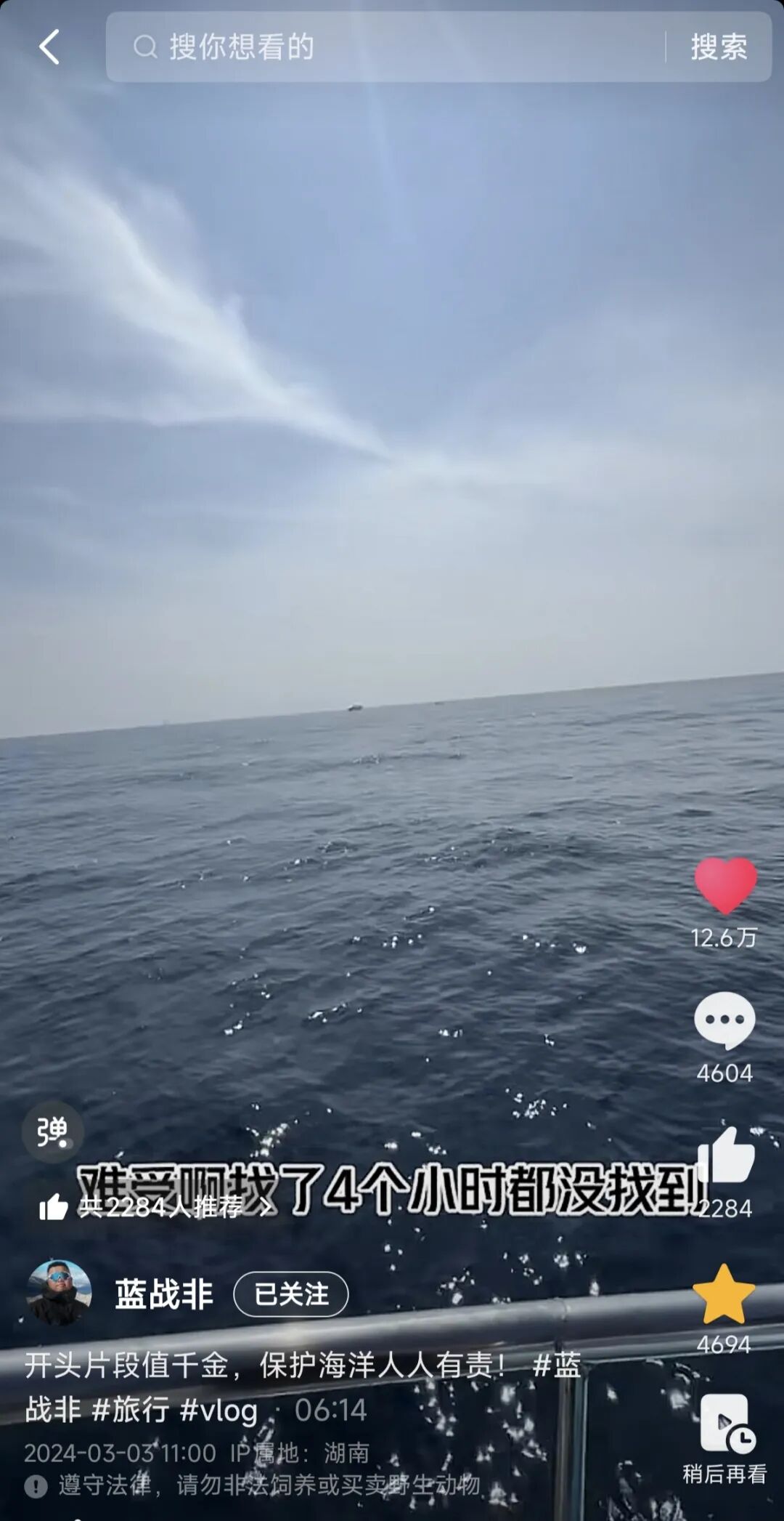 最终却因海洋污染引发的生态破坏未能如愿,无奈感叹“太难受了”,在视频文案里写下了“保护海洋,人人有责”。