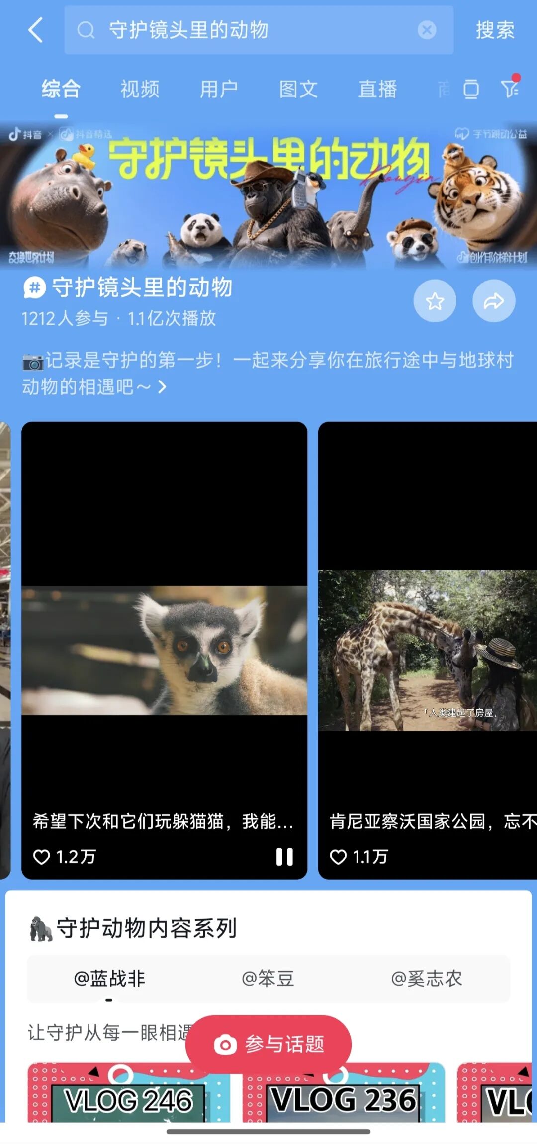 在计划的支持下,动物保护理念引发了创作者们的集体响应,@猫森璐、@追光的 yin 、@洛杉矶嬴政W 等40多位抖音创作者展开共创,深入世界各地,用多元视角记录与动物的相遇故事: