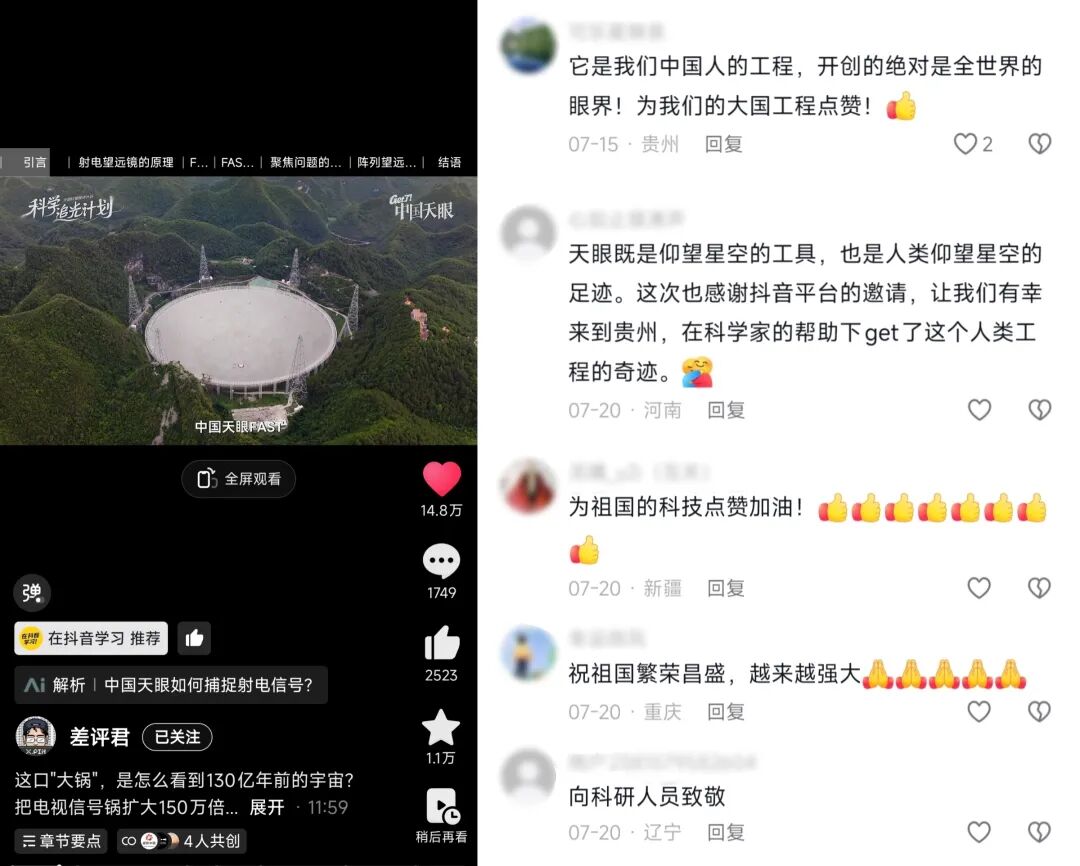 今年5月,抖音就曾组织@差评君、@中国气象爱好者、@来看苏吧、@橙红iris 等10余位抖音精选创作者,在官方指导下首次获准突破“禁区”,零距离深度探访中国天眼,拍摄此前从未公开的馈源舱、反射面板、阵列,近距离接触国之重器,为内容注入独家视角。
