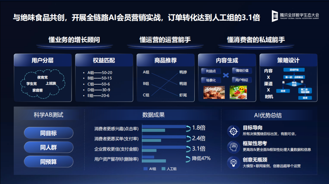 “我们与绝味食品开展了一次全链路AI营销实战,通过多个智能体‘协同作战’,实现从用户洞察到内容推送、权益发放,再到最后成交,营销全程智能化运营。AI组的销售业绩是人工组的3.1倍,内容点击率1.8倍,支付转化率2.4倍(详情见绝味AI数智增长总设计师谌鹏飞:增长战略正被AI重新改写)”。