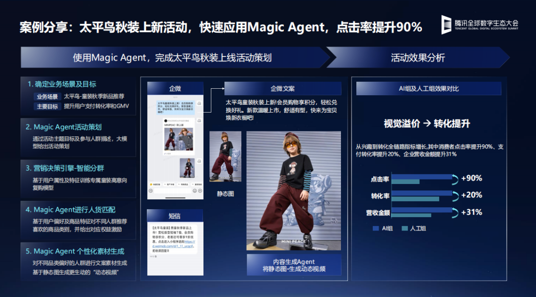 绝味在借助AI带来的全链路优化,实现成倍数的巨大提升。太平鸟则在一个环节就提升了90%效率,对于这家服饰品牌来说,AI最契合的是两个环节:一是客单价较高,对用户再次触达时要求分层的精准率非常高,这方面 Customer AI 的概率预测发挥了关键作用;二是在关键用户交互阶段,内容的丰富度非常重要,通过 AI “图生视频”能力显著提升了这个环节的表现。
