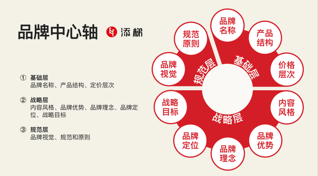 品牌中心轴的基础层、战略层、规范层由“十要素”构成: