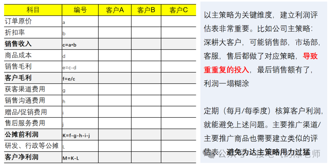 这时候,可以建立评估模型如下图,综合考察大客户的贡献,避免每个部门都打着“深耕大客户”的旗号乱花钱。