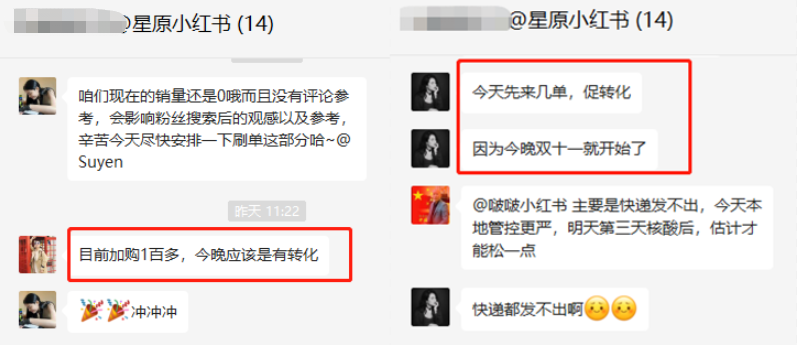 比如说我们操盘的这个项目,品牌也是刚开始投放,就遇到了双十一大促。只投放了几篇笔记就已经加购一百多,如果这时候不赶紧安排销量和好评,流量就会大大流失掉,非常可惜!!!