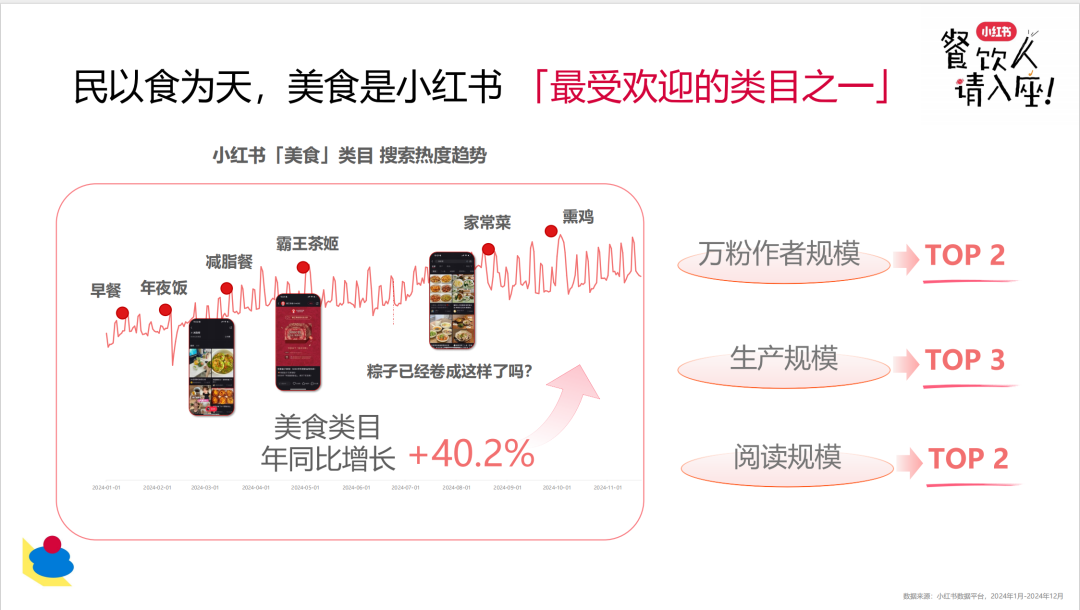 在小红书官方报告,美食搜索热度持续攀升,万粉作者也是第二大规模,这充分说明内容和用户对该品类的热情。