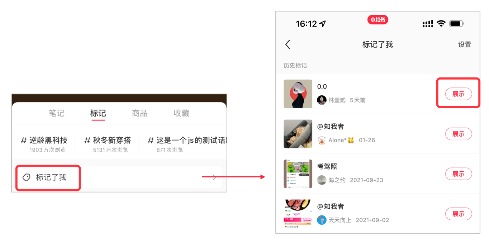 ○ 展示用户笔记:在主页选择【标记页】,点击「标记了我」,选择期望展示的用户笔记即可。