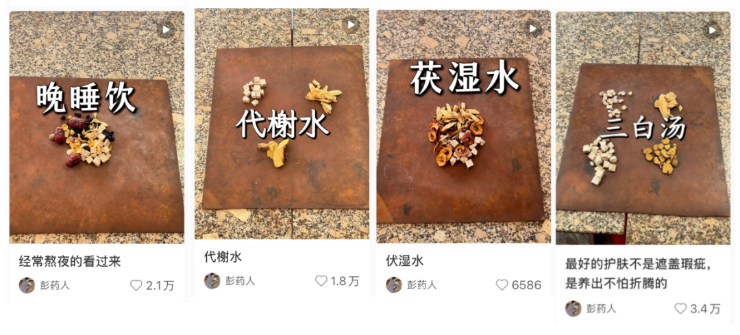 与之相应的,彭售卖的产品也不是单一的药材,而是搭配好的养生饮,这样内容受欢迎、产品契合度高,所以能在第一个月就有还不错的变现。